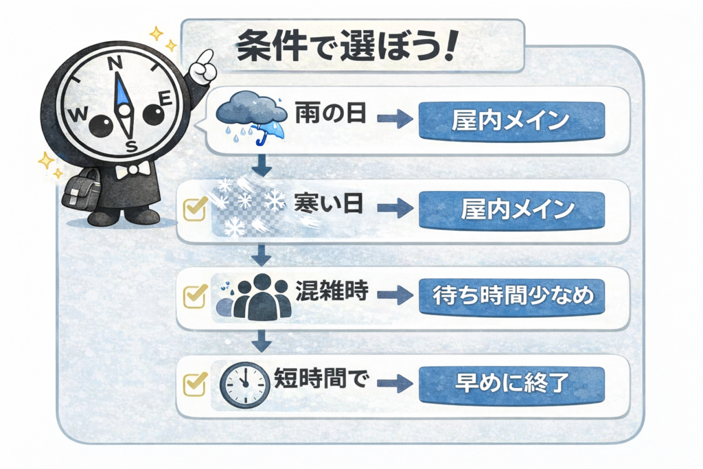雨の日は傘・混雑・移動ロスで時間が伸びやすいので、初心者ほど短めがおすすめです。