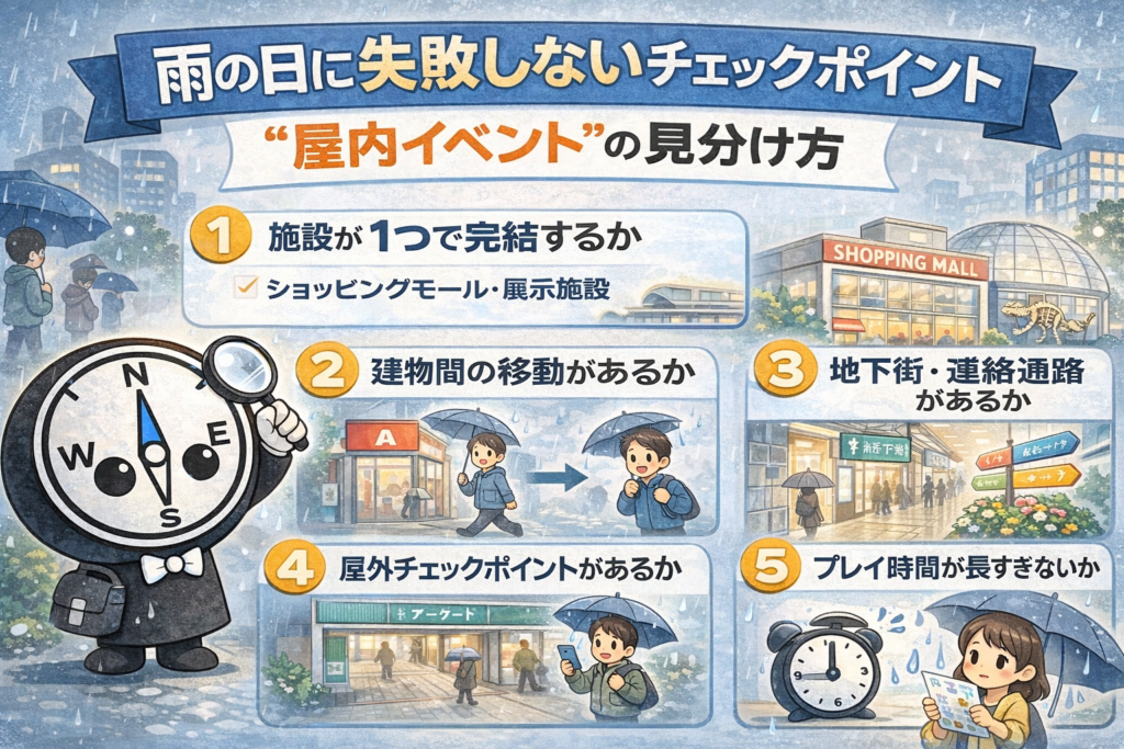 このページでは、雨の日でも快適に遊べるイベントの見分け方を、未プレイでも判断できる外形情報(公式情報+公開レビュー)だけで整理します。