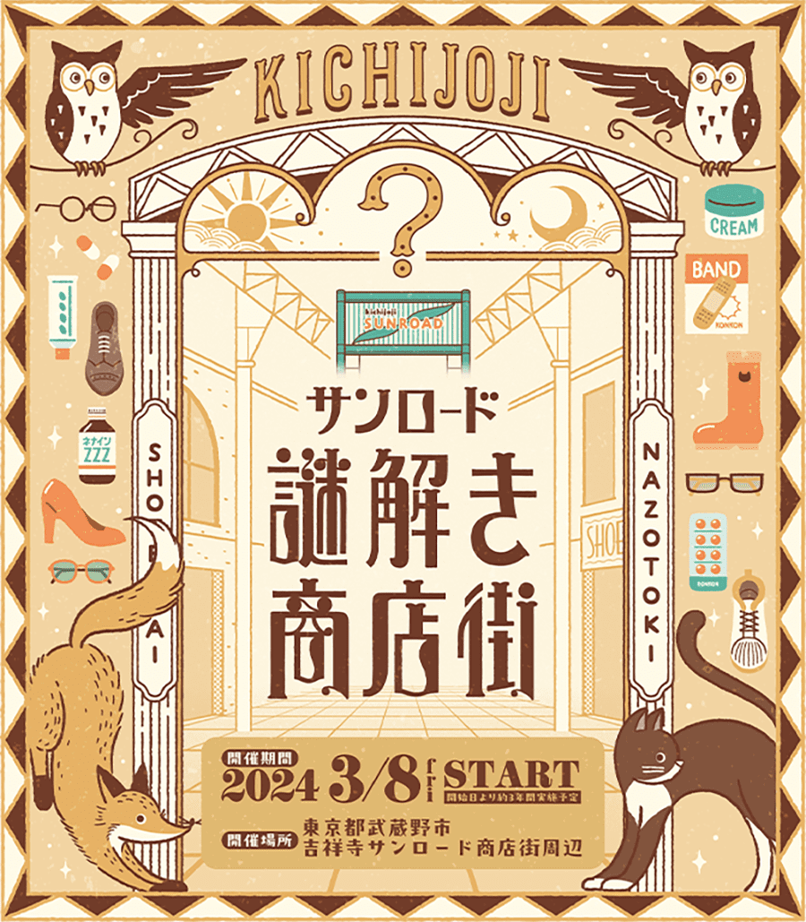 吉祥寺サンロード商店街周辺を巡る、全3コースの常設型周遊イベントです。各コースは独立しており、1コースごとに購入して遊ぶ形式です。進行にはLINE対応スマートフォンが必要で、ヒントも用意されています。商店街アーケード内を中心に動くため天候の影響は比較的小さく、移動範囲も広すぎないタイプです。