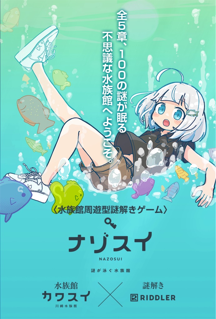 川崎水族館の館内をめぐりながら進める常設の屋内周遊型で、全100問・5チャプター構成です。各チャプターごとに別料金で、一度に全部やるより複数回に分けて進める遊び方が向いています。館内で解く進行が中心で、座れる場所があるという傾向もあり、天候の影響を受けにくいです。解答や進行確認が発生するため、スマホ使用前提で考えておくのが安全です。