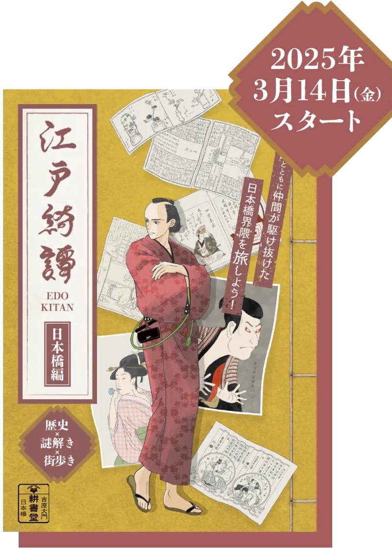 日本橋エリアを実際に歩きながら、蔦屋重三郎に関する歴史や街の要素を拾って進める周遊型です。LINEを使って進行し、現地の看板や店舗まわりを確認しながら進める構成で、最後の一部は自宅でも続けられます。日本橋駅前だけで完結する軽い散歩型ではなく、人形町方面まで含めてしっかり動く前提で考えた方が安全です。筆ペンを使う演出や、世界観に合わせた小物要素もあります。